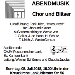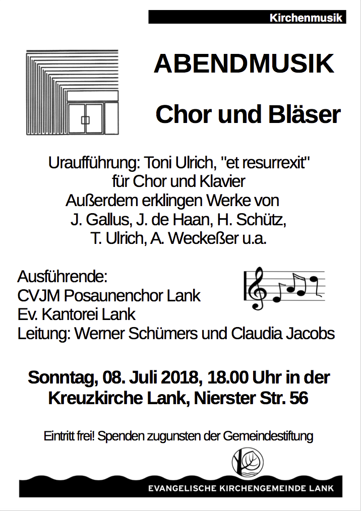 Der Abend wird von Kirchenmusiker/innen des Ev. Kirchenkreises Gladbach-Neuss und der Grevenbroicher Kantorei nach Einstudierung in einem Workshop unter der Leitung des Komponisten gestaltet.